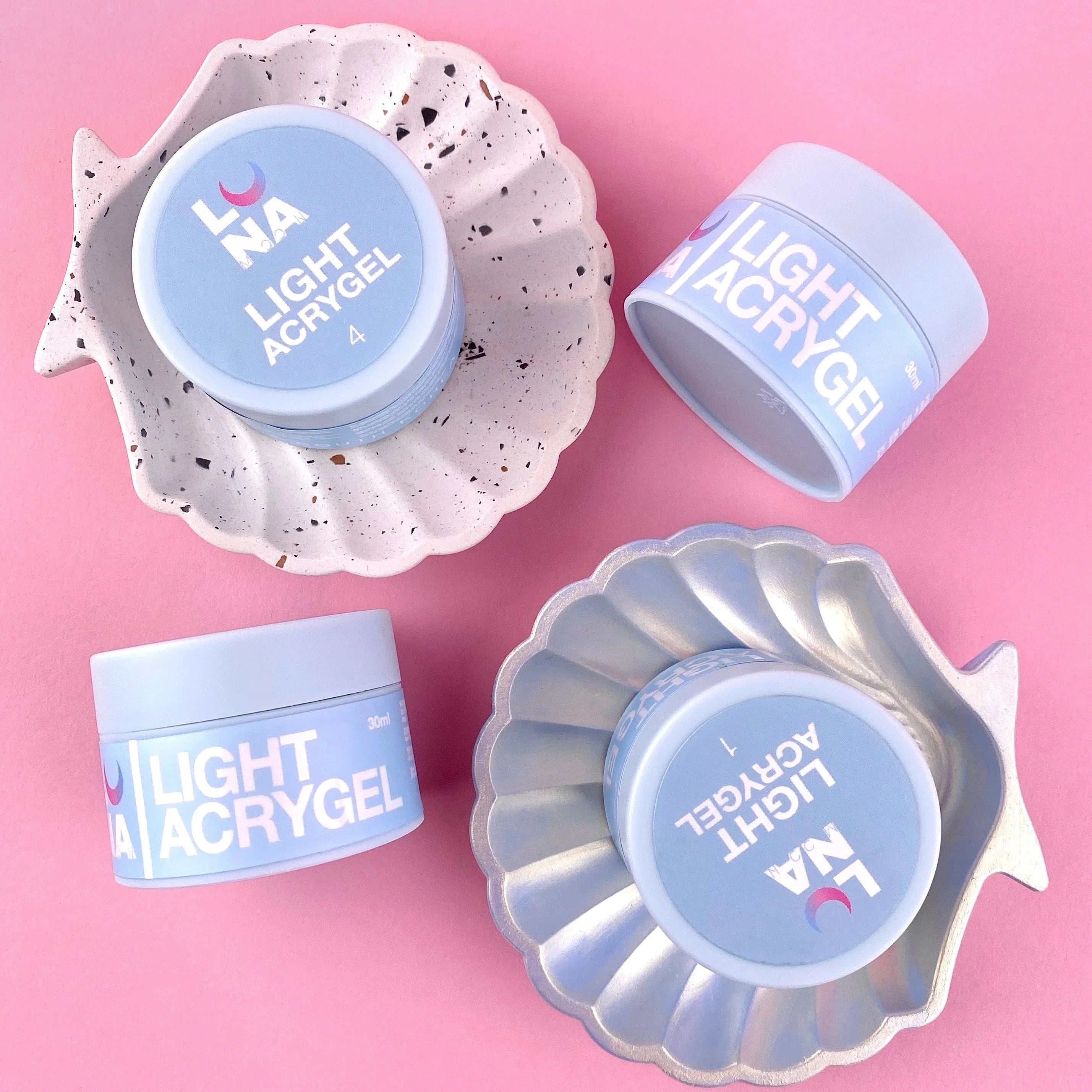 Liquid Light Acrygel is an innovative material for strengthening, nail plate alignment, and short nail extensions (crack repairs). It is suitable for working with both upper and lower forms. It is a symbiosis of polygel and base. It consists of more than half (60-80%) acrylic copolymer, the main component of polygel, and a small amount of hydroxyethyl methacrylate HEMA (approximately 20-30%), the main component of base coatings. It can completely replace bases.