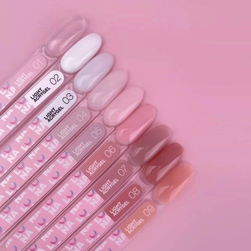 Liquid Light Acrygel is an innovative material for strengthening, nail plate alignment, and short nail extensions (crack repairs). It is suitable for working with both upper and lower forms. It is a symbiosis of polygel and base. It consists of more than half (60-80%) acrylic copolymer, the main component of polygel, and a small amount of hydroxyethyl methacrylate HEMA (approximately 20-30%), the main component of base coatings. It can completely replace bases.